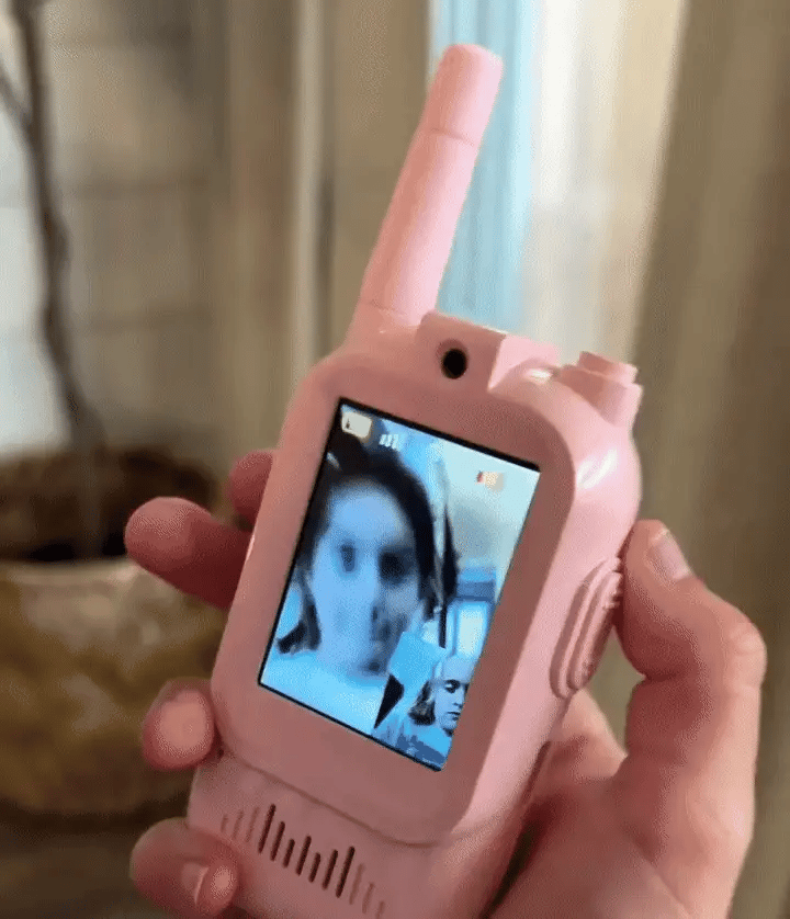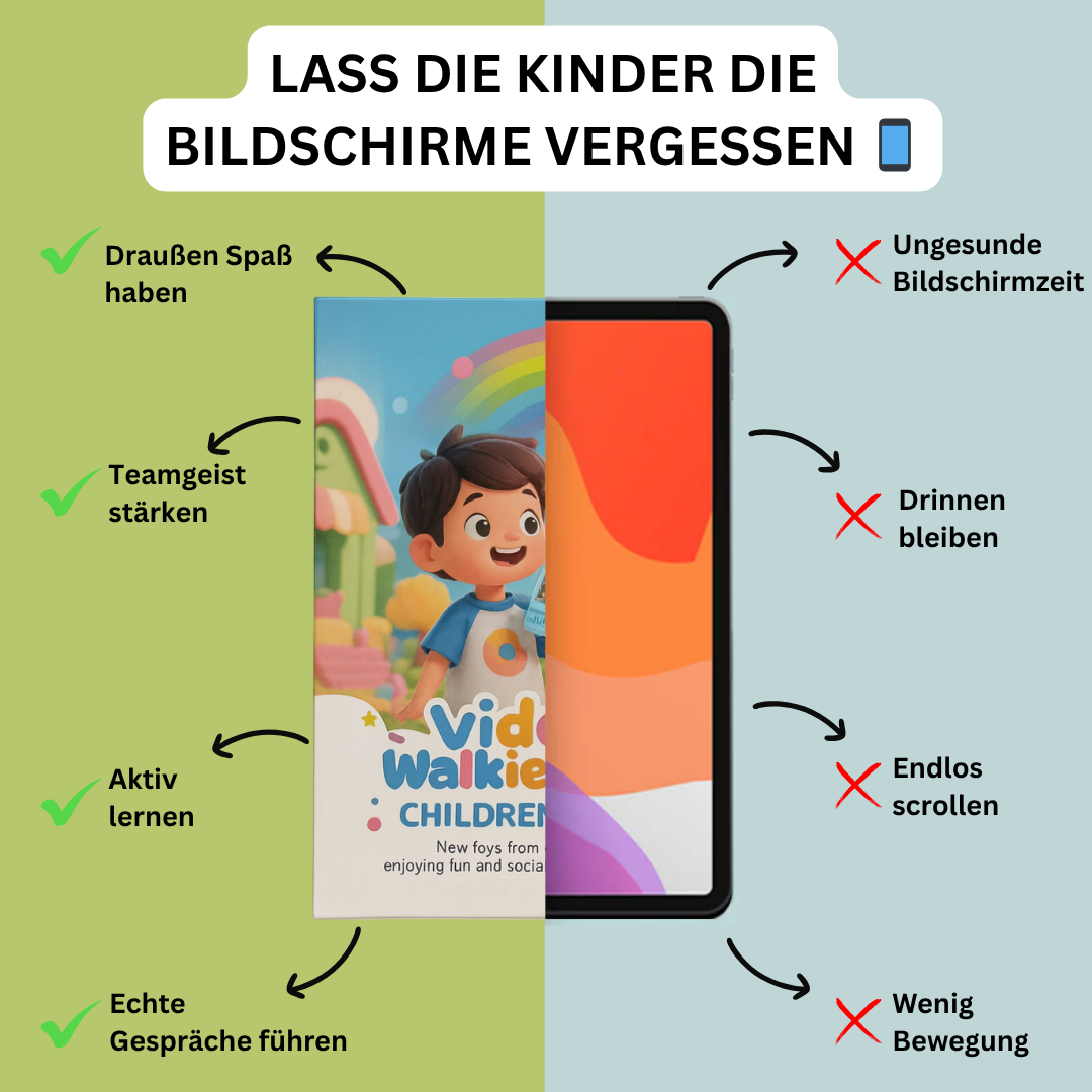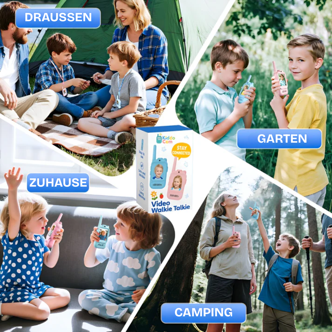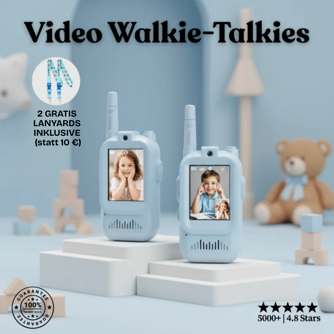 2 Video-Walkie-Talkies (blau + pink), passende Umhängebänder, eine leicht verständliche Anleitung und ein Bonus-E-Book voller kreativer Spielideen, die Kinder überall ausprobieren können.